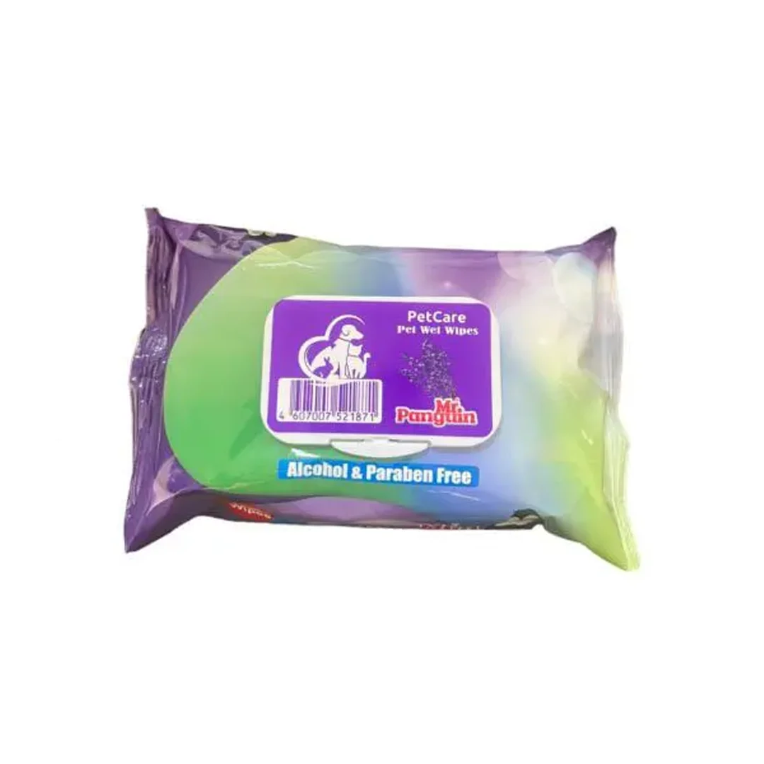 دستمال مرطوب مستر پنگوئن رایحه لاوندر (50 عددی)، مخصوص سگ و گربه. آنتی‌باکتریال و ضد حساسیت، بدون الکل و پارابن. حاوی گلیسیرین و ویتامین برای نرمی پوست و از بین بردن بوی بدن حیوان.