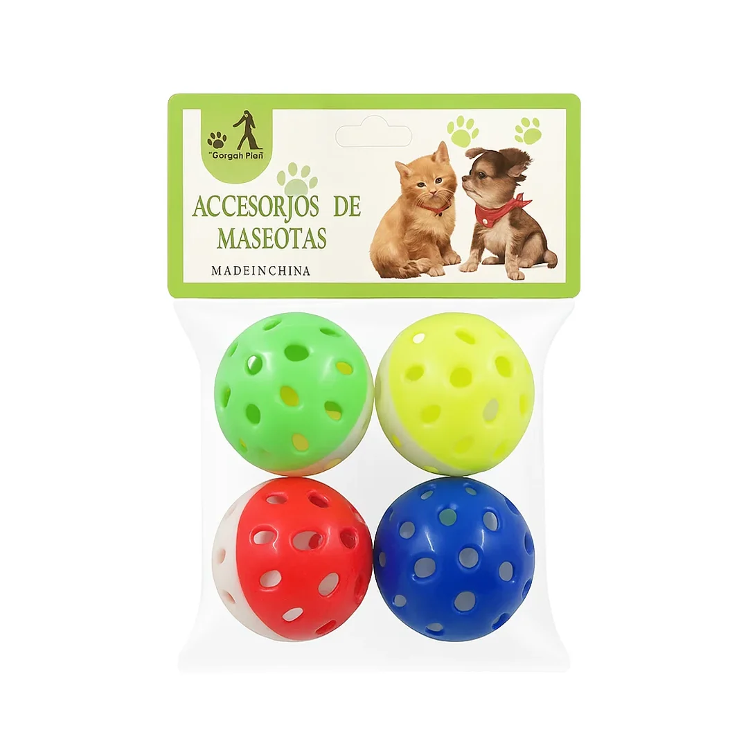 این محصول شامل چهار توپ پلاستیکی با رنگ‌های متفاوت است: سبز، زرد، قرمز و آبی. طراحی هر توپ به صورت یکپارچه و سوراخ‌دار است که باعث سبکی و حرکت سریع آن می‌شود. قطر توپ‌ها حدود ۴.۵ سانتی‌متر بوده و این اندازه استاندارد، هم برای بچه‌گربه‌ها و هم گربه‌های بالغ قابل استفاده و ایمن است. وجود زنگوله داخل هر توپ باعث ایجاد صدای محرک هنگام حرکت می‌شود که برای گربه‌ها فوق‌العاده هیجان‌انگیز است.