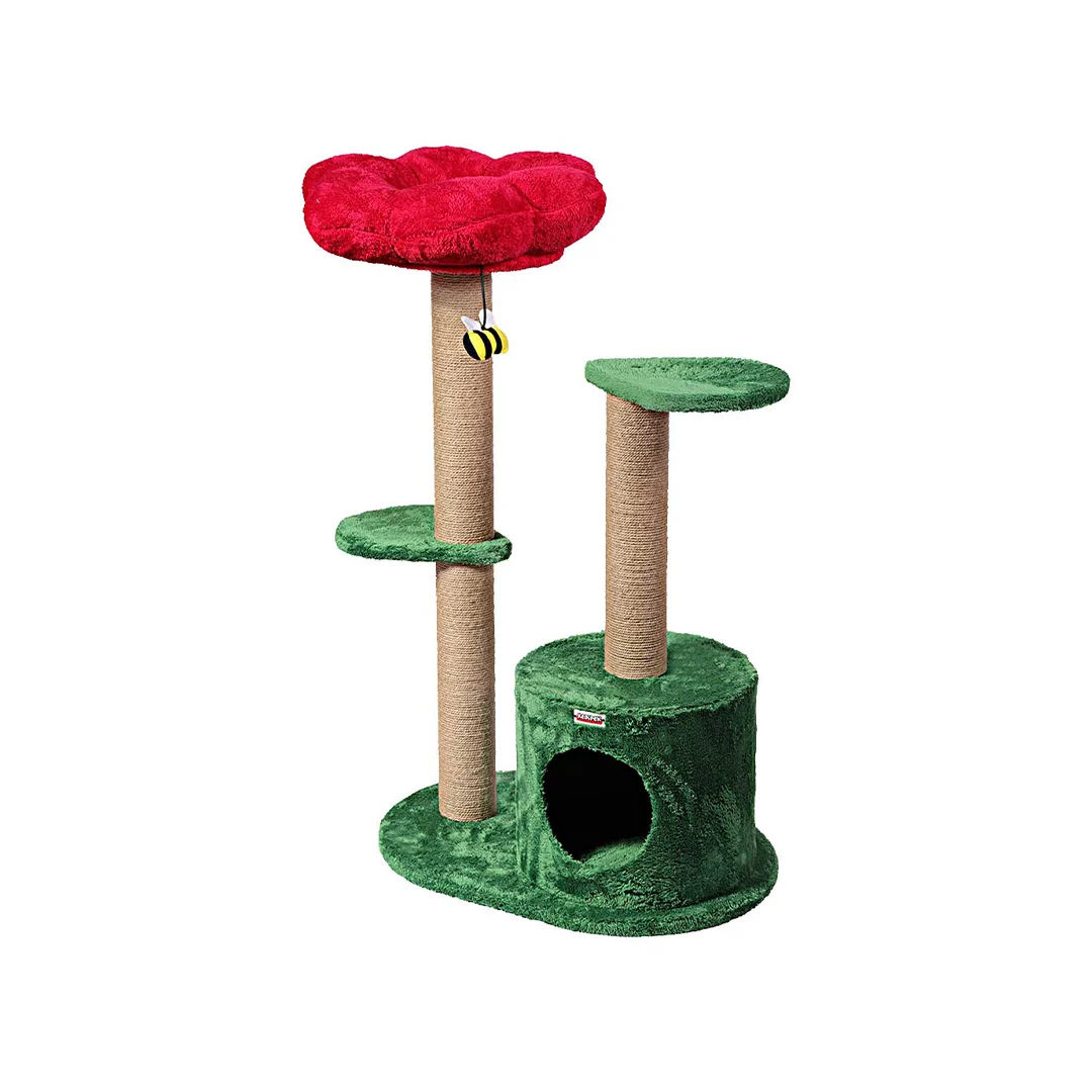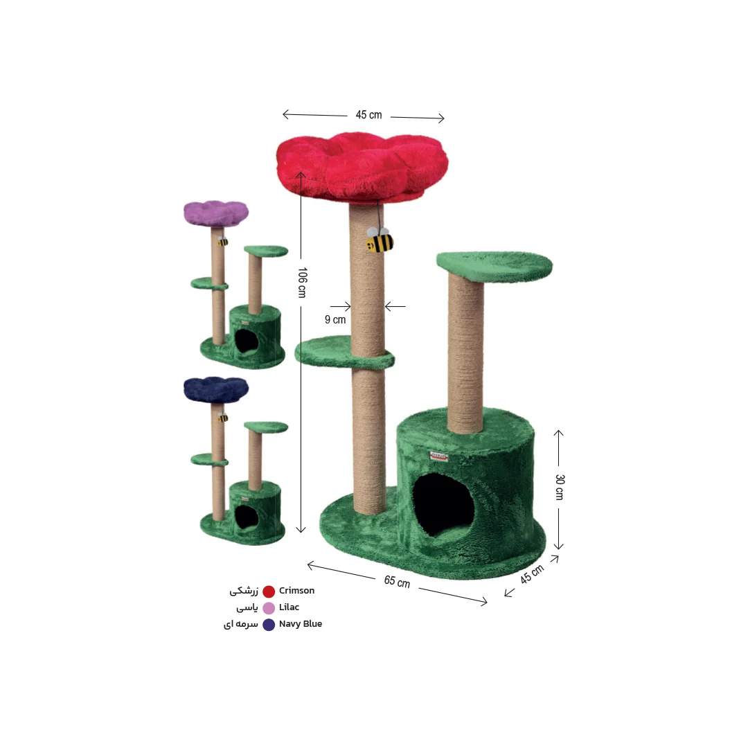 در بخش پایینی این مدل یک لانه استوانهای تعبیه شده است. این لانه محیطی دنج و بسته برای استراحت یا پنهان شدن گربه فراهم میکند. بالاتر از آن، یک جای خواب گلشکل قرار دارد که ظاهر محصول را چشمنوازتر کرده و فضایی راحت برای لمدادن گربه ایجاد میکند.