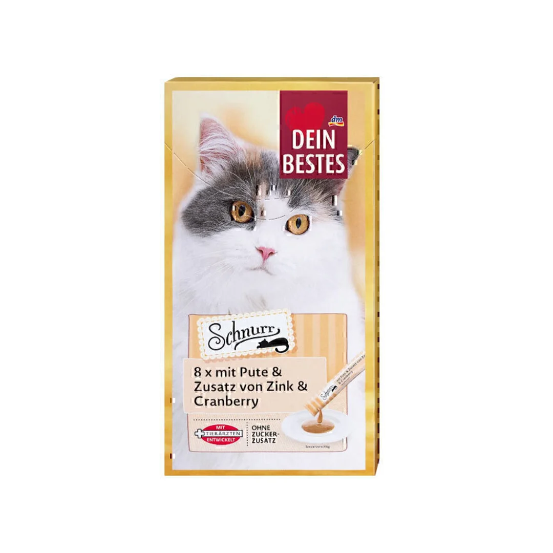 بستنی گربه دین بستس با طعم بوقلمون و زغال‌اخته (Dein Bestes Turkey & Cranberry Creamy Snack) یک میان‌وعده خامه‌ای و خوش‌طعم برای تمامی نژادهای گربه است. این محصول با ترکیب طبیعی گوشت بوقلمون و زغال‌اخته، فاقد مواد نگهدارنده و رنگ مصنوعی بوده و به‌دلیل طعم لذیذ و ارزش غذایی بالا، به تقویت سیستم ایمنی و تحریک اشتهای گربه‌ها کمک می‌کند.