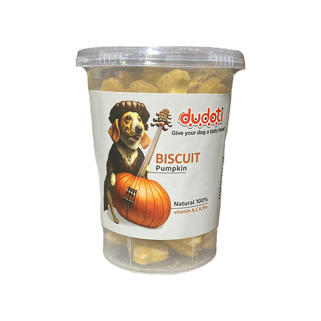 بیسکویت سگ دودوتی طعم کدو حلوایی – ۱۵۰ گرم (Dudoti Dog Treat Pumpkin Flavor – 150g) یک میانوعده سالم و مغذی برای سگهاست که با طعم طبیعی کدو حلوایی و ترکیب ویتامینهای A و K، به سلامت عمومی بدن حیوان کمک میکند.