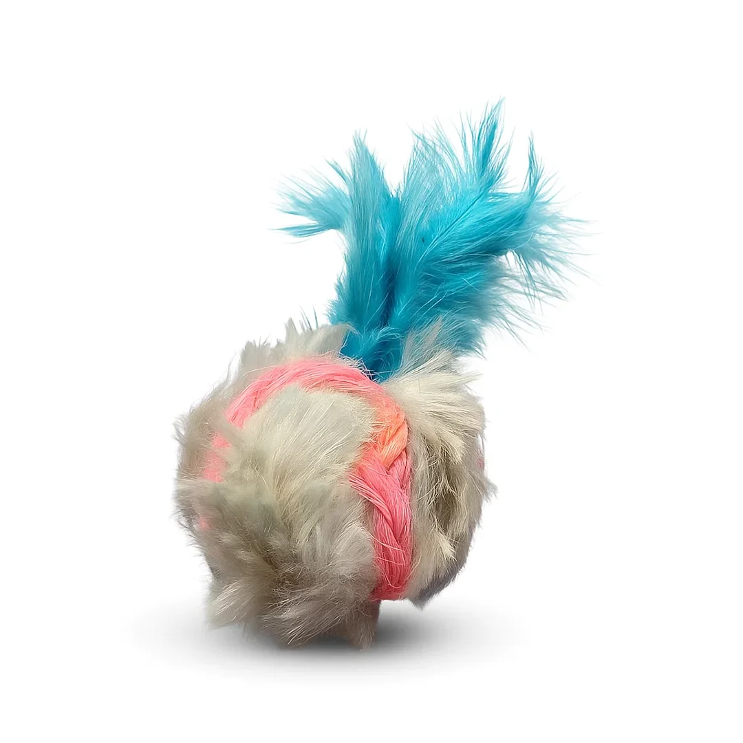 هسته اصلی توپ با الیاف کنفی مقاوم پوشانده شده و بخشی از سطح آن با خز مصنوعی نرم تزئین شده است. وجود پرهای رنگی در قسمت بالایی، توجه گربه را سریع جلب می‌کند و باعث می‌شود اسباب‌بازی شبیه موجودی کوچک و پویا به نظر برسد. این جذابیت بصری گربه را تحریک می‌کند تا توپ را دنبال کند، بپرد یا با پنجه‌هایش آن را شکار کند.