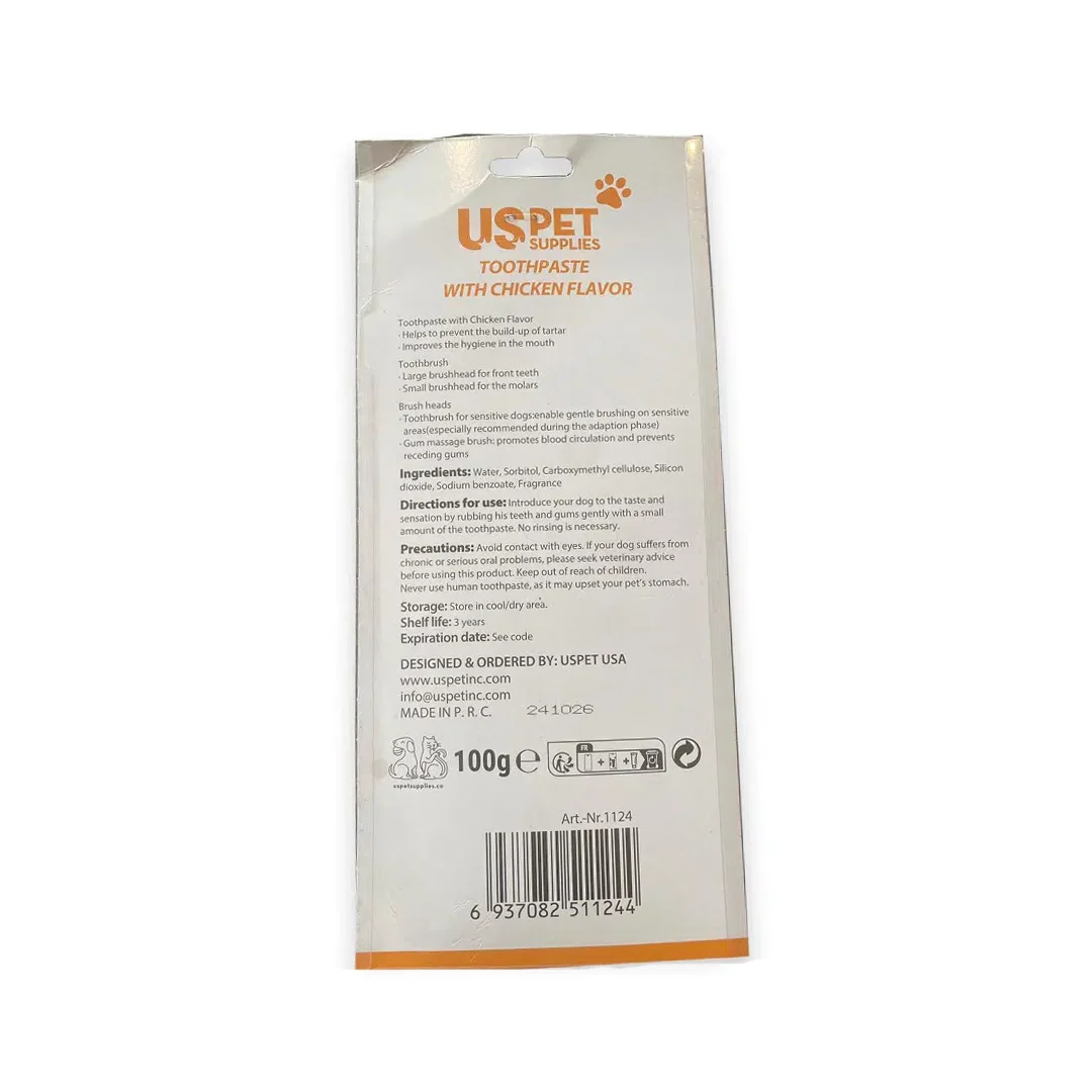 ست مسواک و خمیر دندان سگ یو اس پت (USPet Dog Dental Set Chicken Flavor 100g) یک راهحل کامل برای بهداشت دهان و دندان سگهای شماست. این ست شامل خمیردندان با طعم مرغ، یک مسواک دوطرفه (برای دندانهای جلو و عقب) و دو مسواک انگشتی است که امکان تمیز کردن دقیقتر و ملایمتر لثهها و دندانها را فراهم میکند.