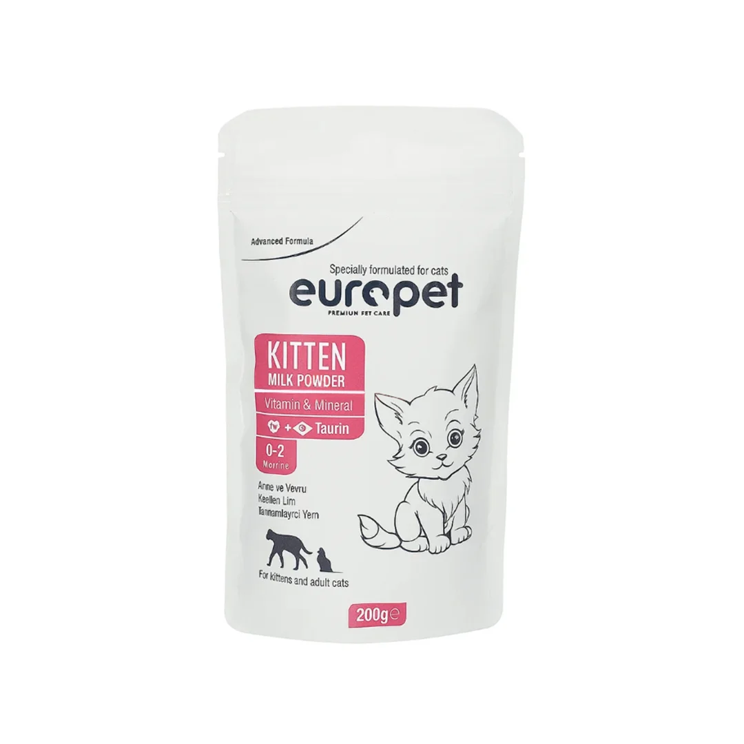 شیر خشک یوروپت مخصوص بچه‌گربه‌ها (200 گرم)، فرمولاسیون مشابه شیر مادر. حاوی تورین، ویتامین‌ها و مواد معدنی ضروری برای تقویت قلب، بینایی و استخوان‌بندی. مناسب برای تمامی نژادها و گربه‌های 0 تا 2 ماه.