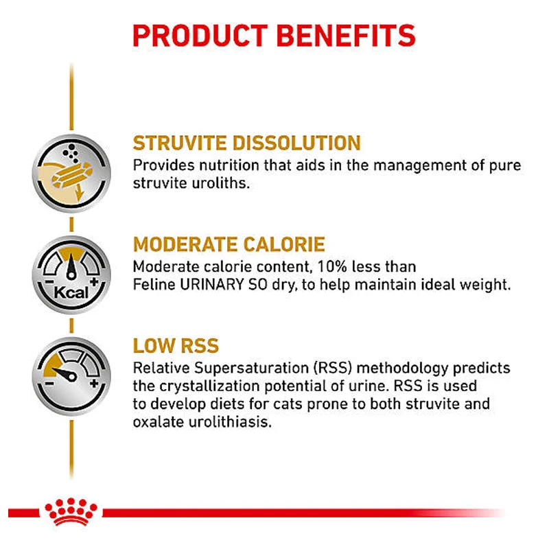 همچنین این غذا با فرمول ادراری تخصصی RSS پایین، مانع از رسوب مجدد کریستالها در مثانه میشود.