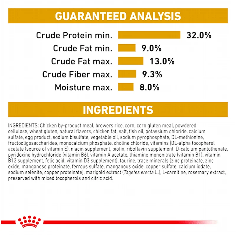 برنج، گلوتن گندم، پروتئین مرغ خشک، آرد ذرت، چربی حیوانی، پروتئین حیوانی هیدرولیز شده، گلوتن ذرت، روغن ماهی، روغن سویا، مواد معدنی و فیبرهای گیاهی.