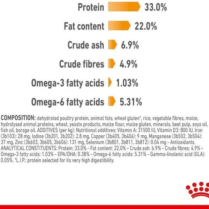 غذای گربه رویال کنین Hair & Skin Care با پروتئین قابلهضم بالا (L.I.P) از گوارش سالم پشتیبانی میکند و با تنظیم pH ادرار بین ۶ تا ۶.۵ از سلامت دستگاه ادراری نیز محافظت مینماید.
