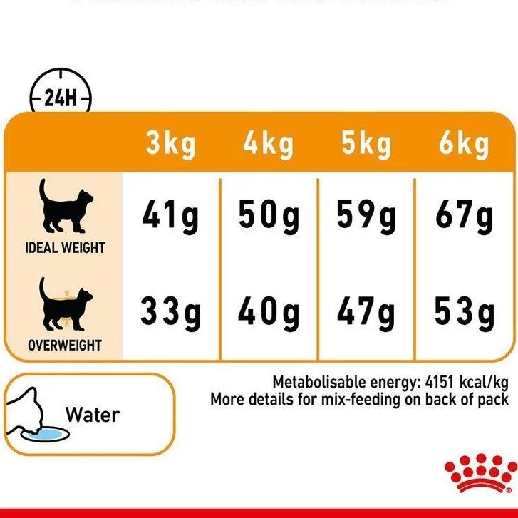 سهمیهی روزانه را بر اساس وزن گربه تنظیم کنید (به جدول روی بسته مراجعه شود) و همیشه آب تمیز در اختیار حیوان قرار دهید.