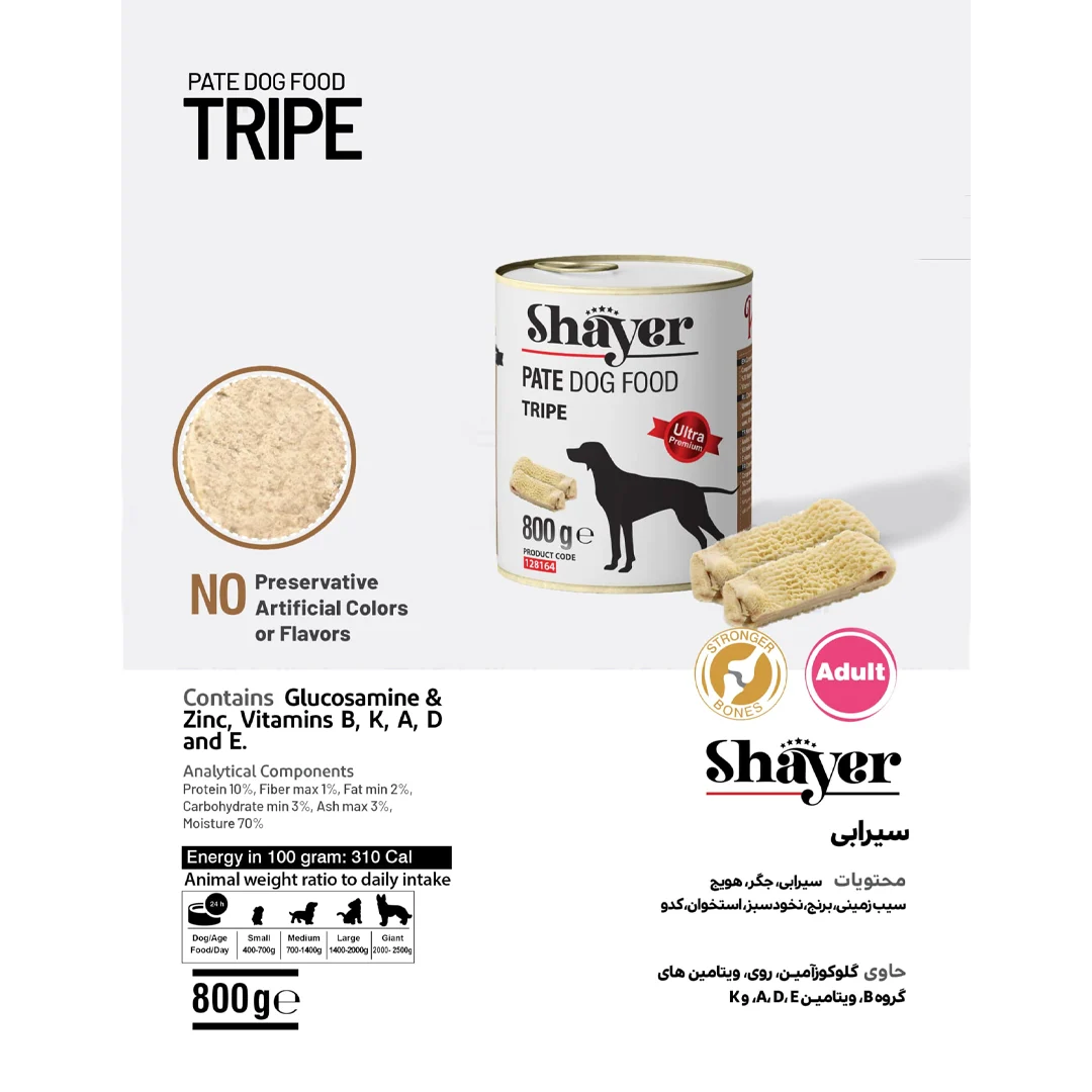 کنسرو غذای سگ شایر مدل Pate With Tripe یک غذای کامل، طبیعی و خوشطعم برای سگها در تمامی سنین است. این محصول با ایمولسیون یکنواختشدهی سیرابی و جگر تازه تهیه شده و با ترکیبات غنی خود، تمام نیازهای تغذیهای پت شما را تأمین میکند.