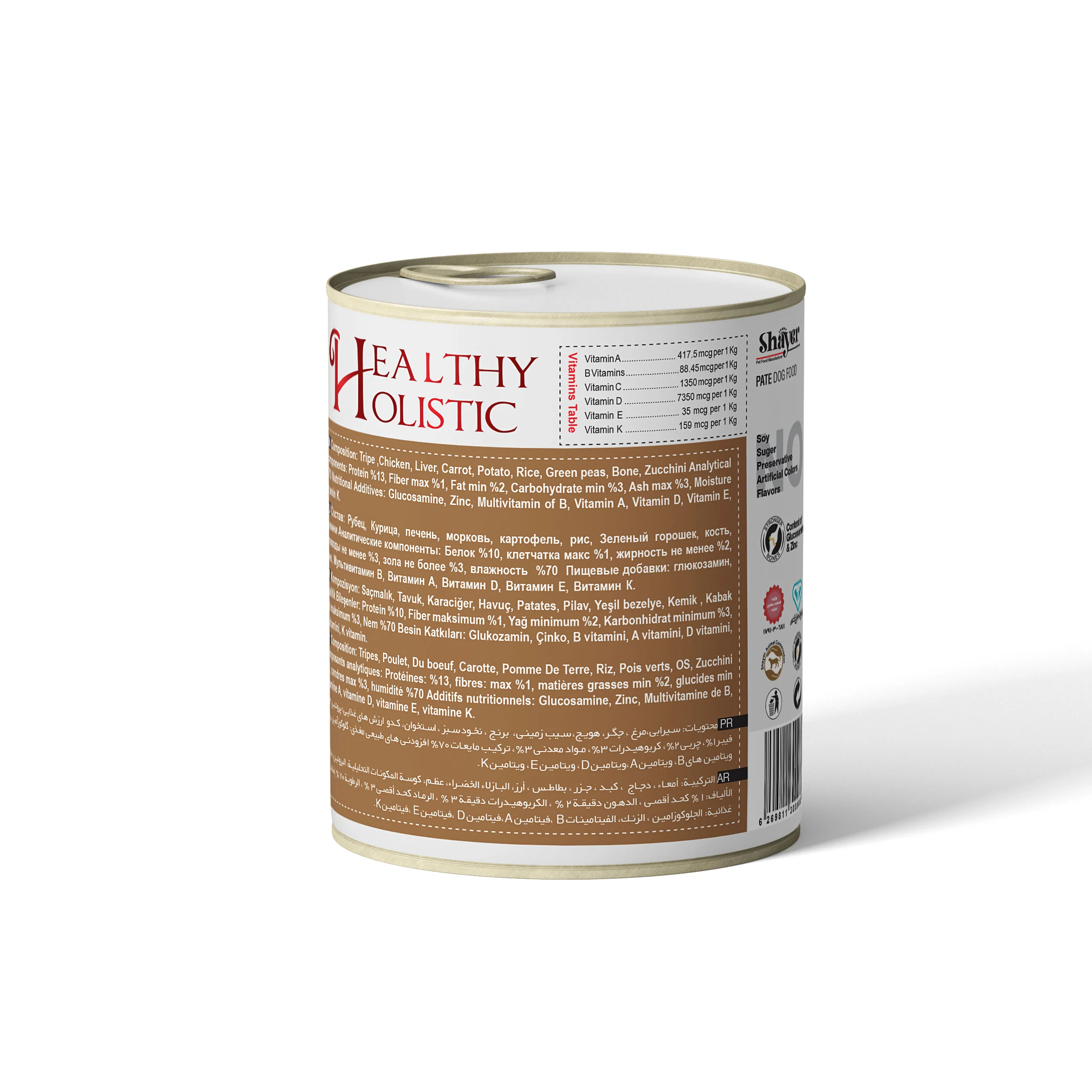 در ترکیب این کنسرو از سیرابی، جگر، مرغ، هویج، سیبزمینی، برنج، نخود سبز، کدو و استخوان استفاده شده است تا علاوه بر طعم لذیذ، ارزش تغذیهای بالایی داشته باشد. وجود زینک و گلوکوزامین موجب استحکام استخوانها و بهبود عملکرد مفاصل میشود، در حالی که ویتامینهای A، D، E، K و گروه B به تقویت سیستم ایمنی، رشد سالم مو و عملکرد طبیعی دستگاه عصبی کمک میکنند.