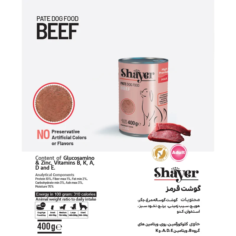 کنسرو غذای سگ شایر مدل Pate With Beef محصولی باکیفیت و مغذی برای تمامی سنین و نژادهای سگ است. این کنسرو با فرمولی غنی از پروتئین و امگا ۳ و ۶، انتخابی مناسب برای سگهایی است که به رژیم غذایی متعادل و طبیعی نیاز دارند.