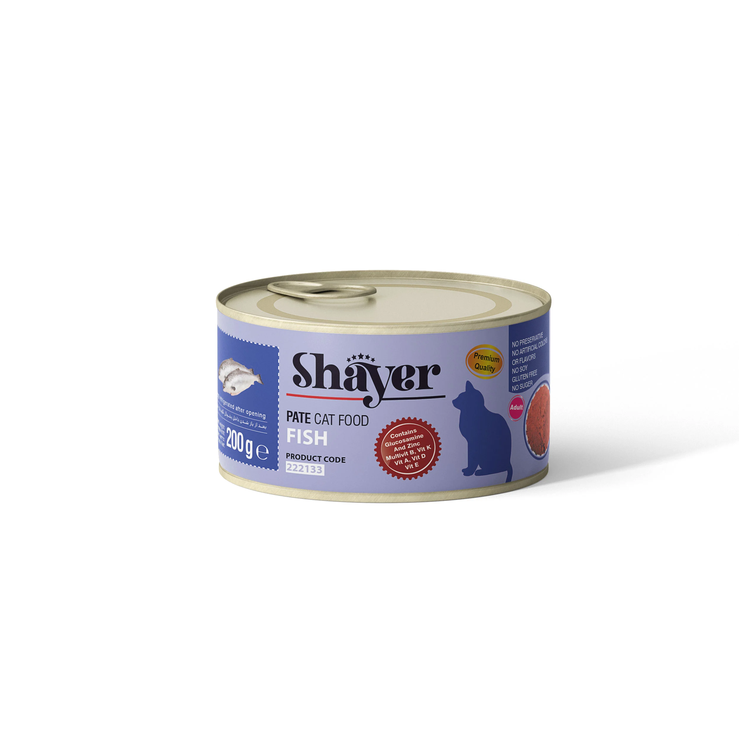 کنسرو گربه شایر با طعم ماهی (Shayer Pate With Fish) با وزن ۲۰۰ گرم، یک وعده غذایی مغذی و کامل است که برای گربه‌ها در تمامی سنین و نژادها مناسب می‌باشد. این محصول از ترکیب گوشت ماهی تازه، جگر، تخم‌مرغ، هویج، سیب‌زمینی و برنج تهیه شده و به صورت پته نرم و یکنواخت عرضه می‌شود.