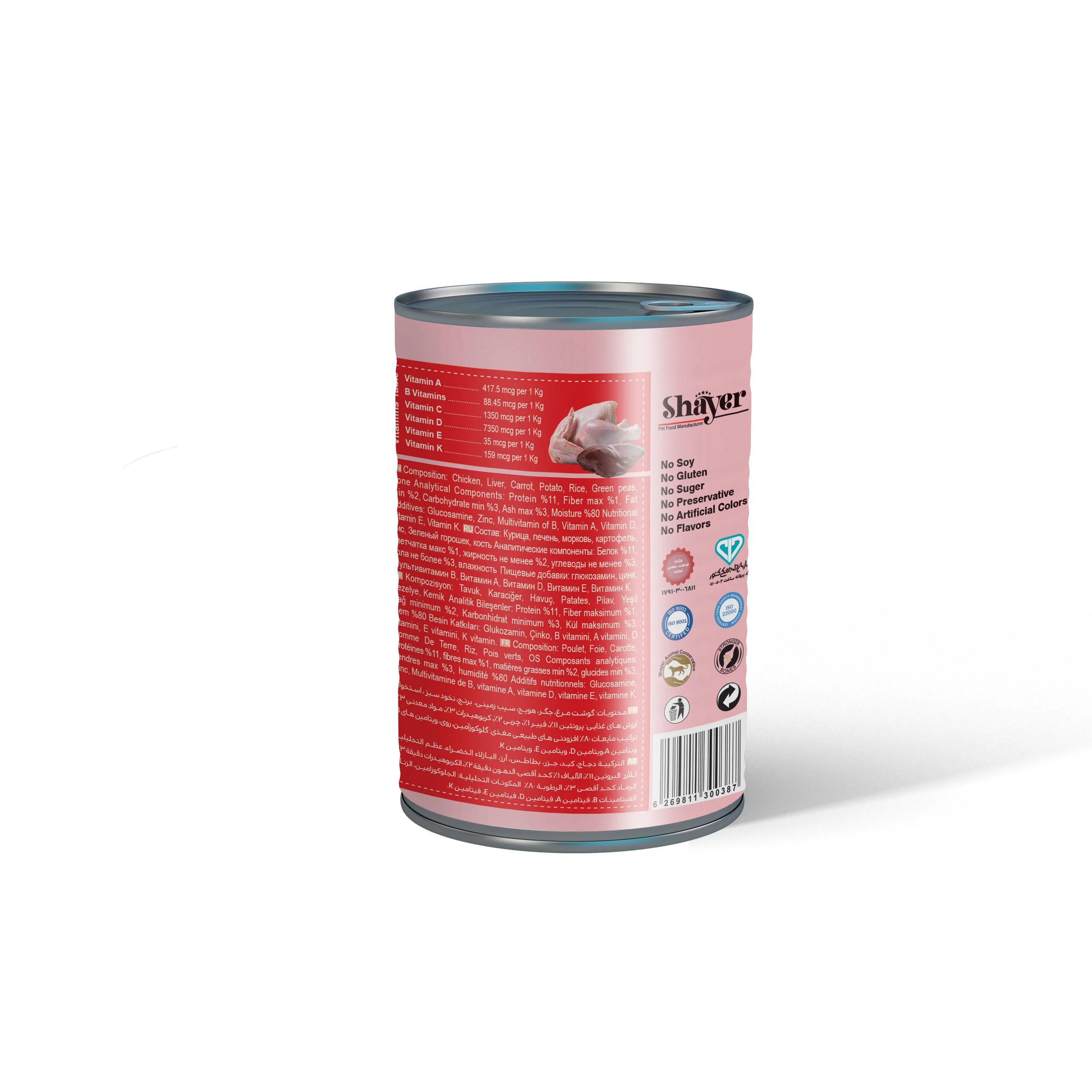 ترکیبات: مرغ تازه، جگر، تخممرغ، برنج، هویج، سیبزمینی