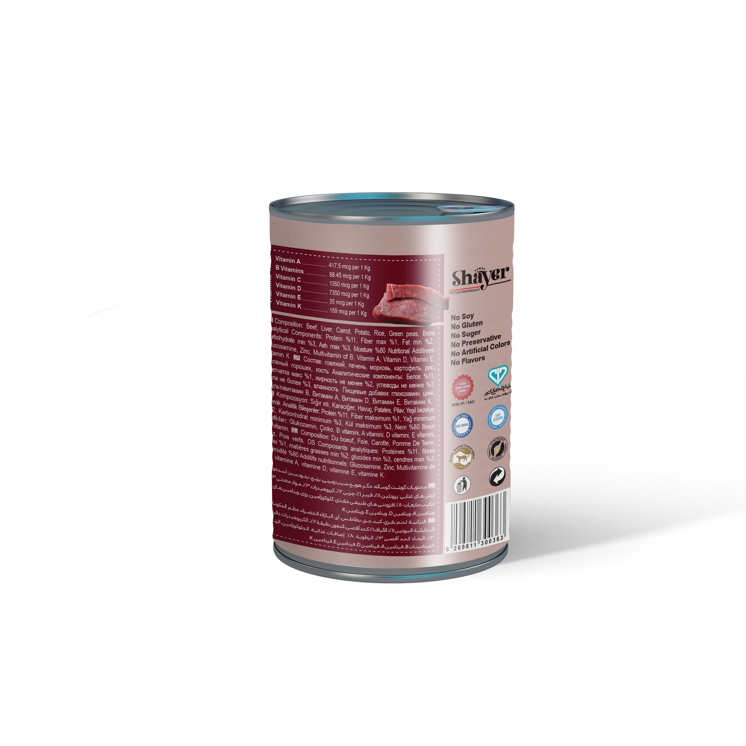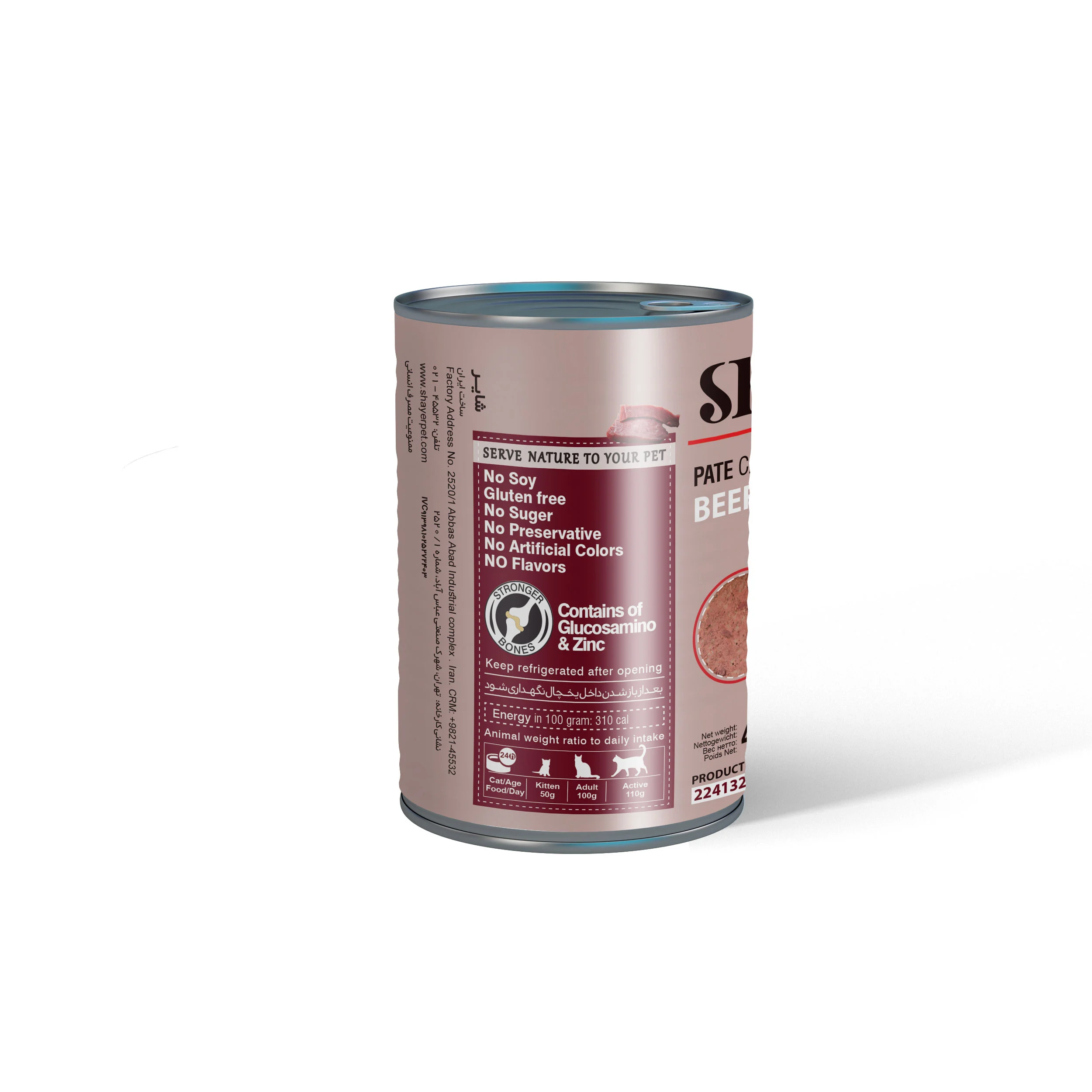کنسرو پته شایر با گوشت قرمز تازه، جگر و سبزیجات طبیعی؛ سرشار از پروتئین، ویتامینها، زینک و اسیدهای چرب امگا ۳ و ۶. مناسب برای گربههای تمامی سنین.