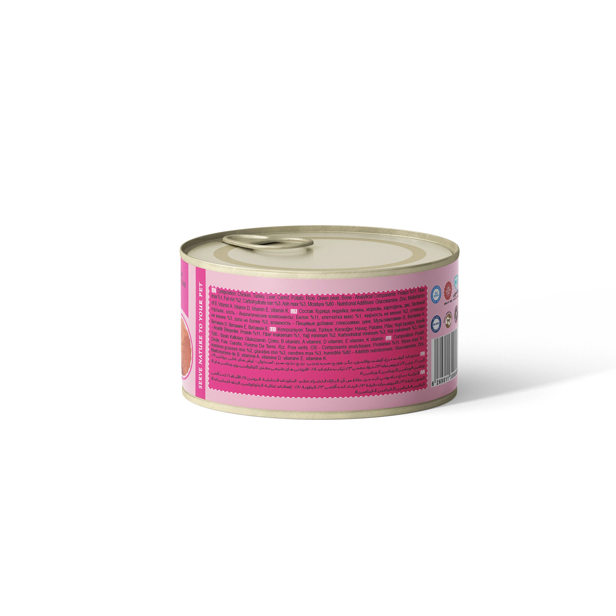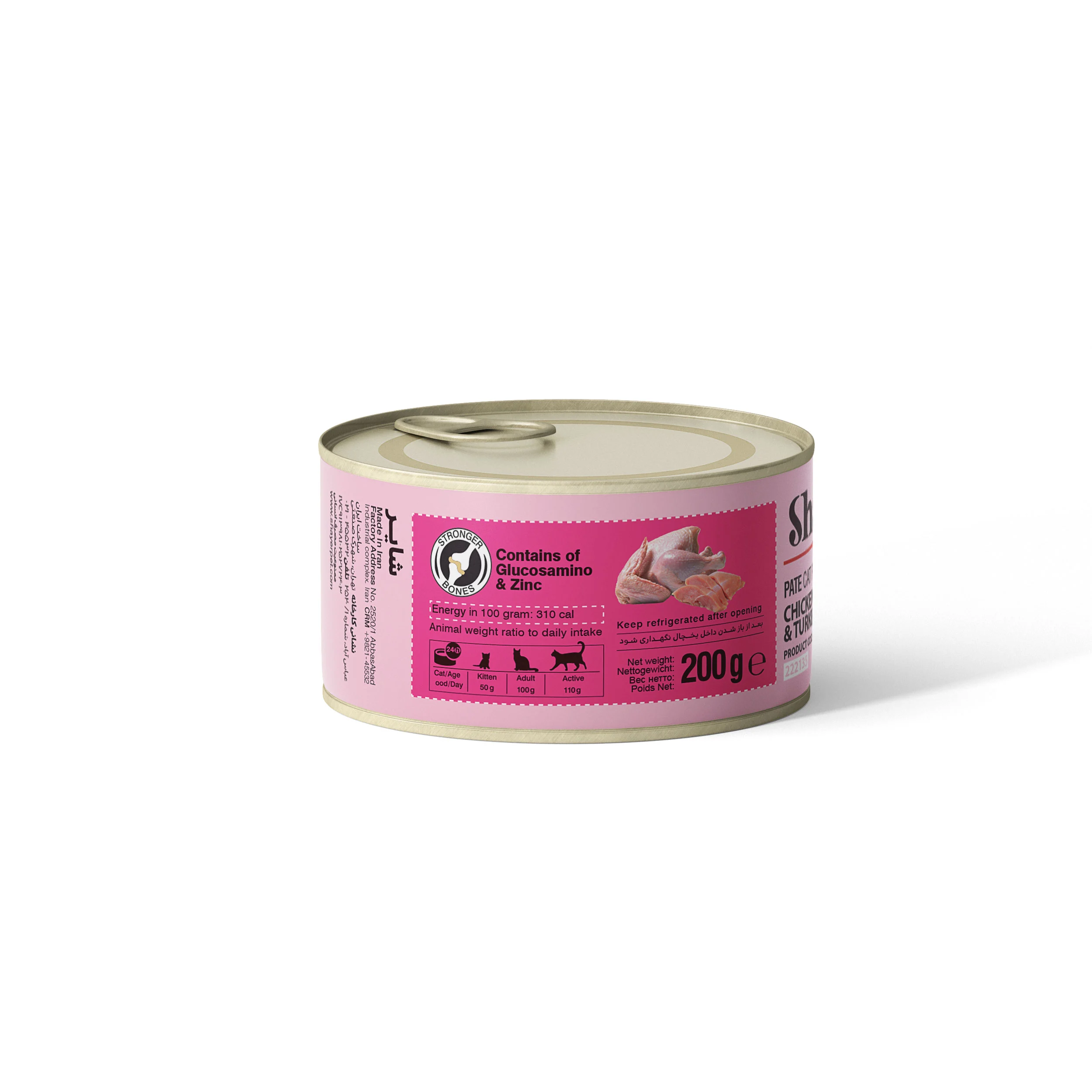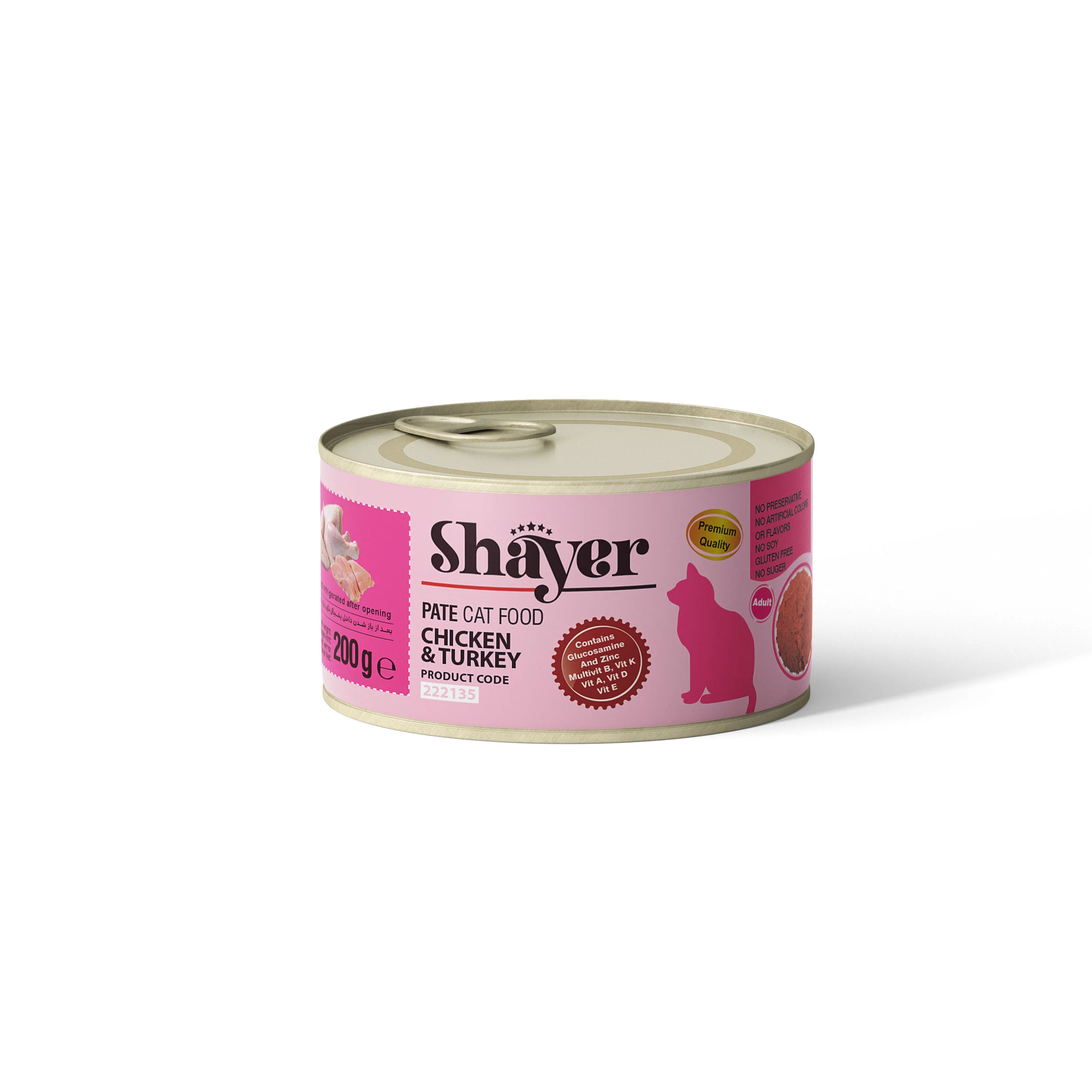 کنسرو گربه شایر مرغ و بوقلمون (Shayer Pate With Chicken & Turkey) با وزن 200 گرم، یک غذای کامل و متعادل برای گربههای بالغ تمامی نژادهاست. این کنسرو از مرغ تازه و گوشت بوقلمون باکیفیت تهیه شده و فاقد افزودنیهای شیمیایی، شکر، نمک و گلوتن است.