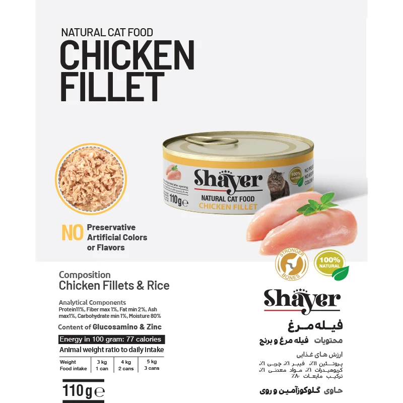 کنسرو Shayer Natural Chicken Fillet یک غذای کامل، سالم و طبیعی است که تمامی نیازهای تغذیه‌ای گربه را در وعده روزانه تأمین می‌کند و گزینه‌ای عالی برای گربه‌های حساس و بدغذا محسوب می‌شود.